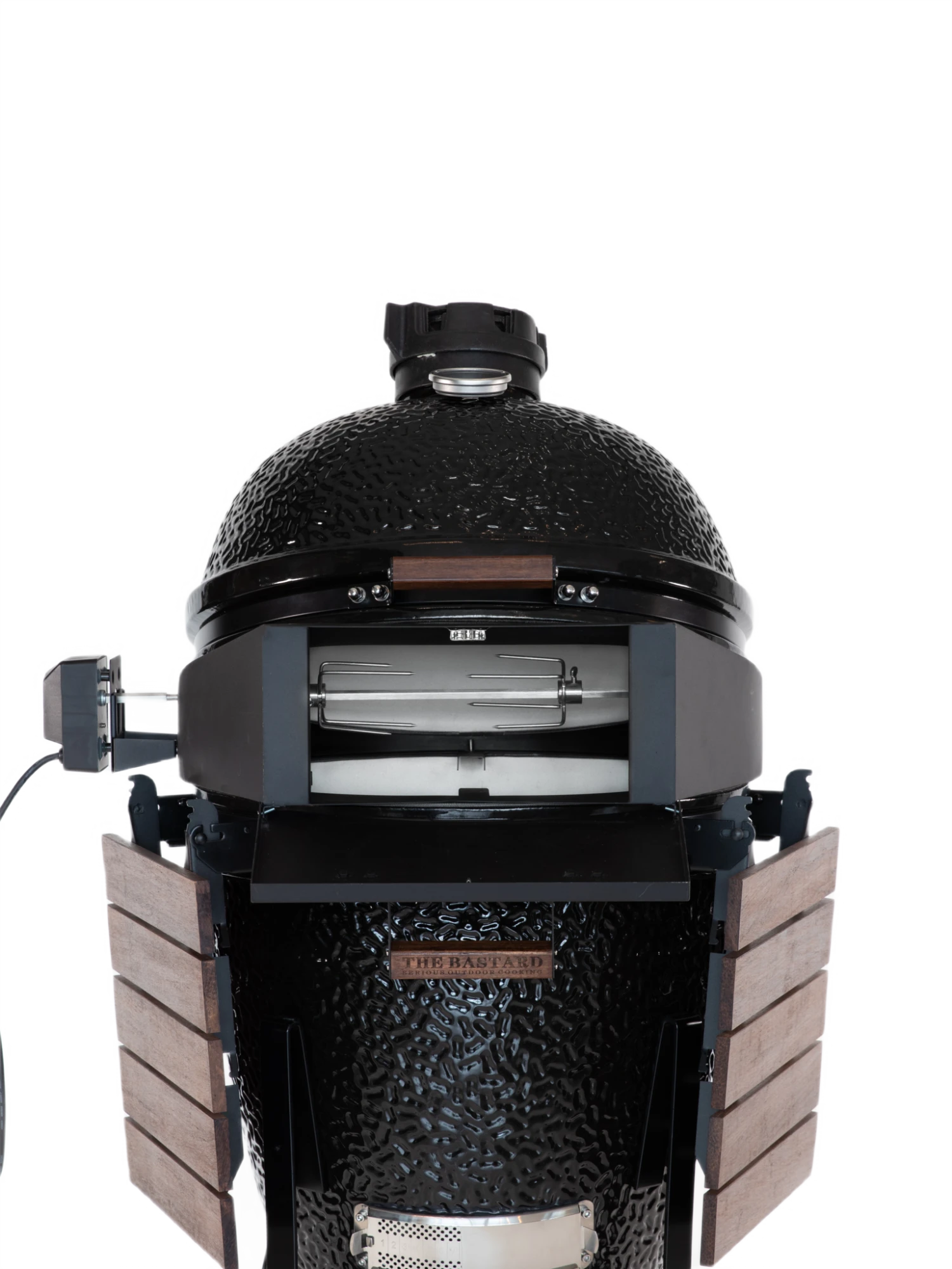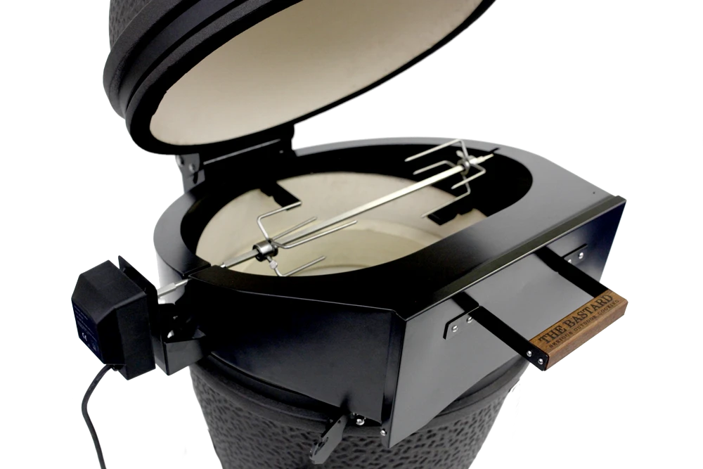 De Bastard rotisserie verzekert niet alleen de perfecte grill door voorzichtig roterend voedsel boven het vuur, het transformeert je kamado in de perfecte pizzaoven. De deksel blijft gesloten, je kunt het deurtje openen en je pizza er super makkelijk met de pizza schep in schuiven zonder warmte te verliezen!